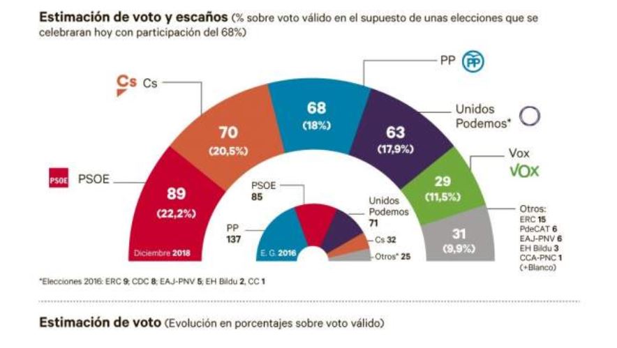 Si las votaciones fueran ahora el esquema sería más o menos así. Aunque no hay nadie que se crea que las encuestan dan por hecho, para un esquema. La gente miente más que habla. Según la estimación de voto Ciudadanos sería el segundo partido más votado y como oposición a la izquierda, un mundo mágico de color. Sería Toto, el perrito, en el Mago de Oz, donde un huracán se lo lleva más allá del Arco Iris. Un mundo surrealista donde se pierde la mente y conciencia. Un mundo donde solo los perros tienen conciencia de ser. Los humanos la pierden y tienen que ser ayudados por sus mascotas. No todo lo que se halla más allá del Arco Iris, es bueno. Ciudadanos aspira a traspasar esa barrera hacia el egocentrismo de Sánchez. Hmmm, que peligro encierra esa puerta dimensional. Ya nos pronosticó la CIA que España se vería en un problema grave a corto espacio de tiempo. Los tiempos han llegado y han venido acompañados de una nueva recesión... España caerá asesinada por sus mandatarios.